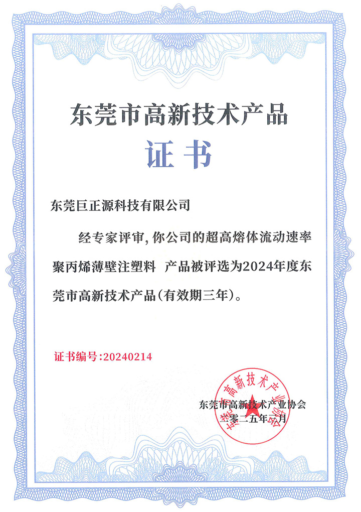 日前,東莞市高新技術產(chǎn)業(yè)協(xié)會公布了2024年東莞市高新技術產(chǎn)品名單。東莞巨正源科技有限公司自主研發(fā)、生產(chǎn)的超高熔體流動速率聚丙烯薄壁注塑料產(chǎn)品成功入選,被評選為2024年度東莞市高新技術產(chǎn)品,有效期三年。